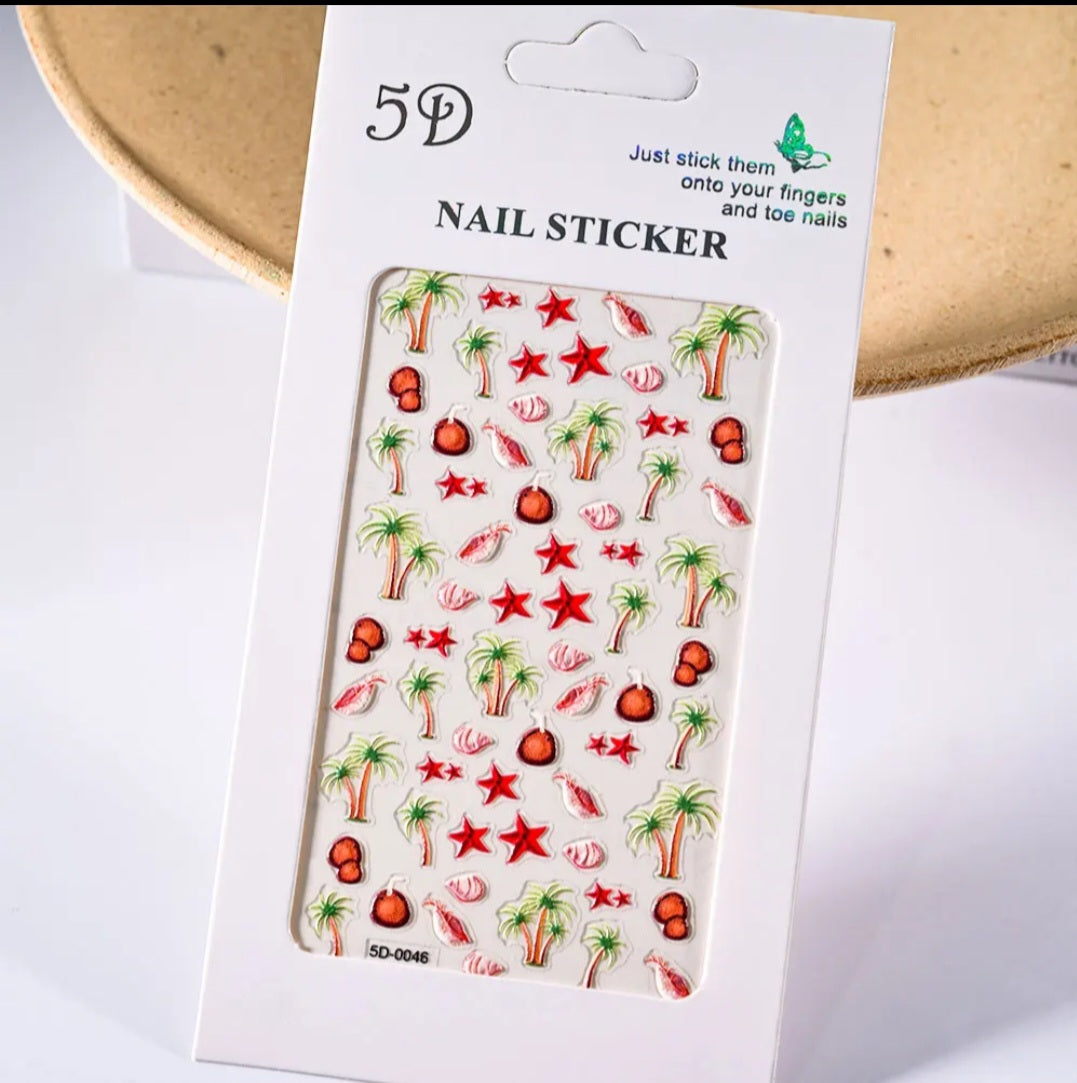 Lighten up your summer sets with Tropical Mini 5D Stickers – 5D-0046. Packed with tiny palm trees, coconuts, starfish, and coral-toned shells, this sheet keeps it beachy without the bulk. The 5D puff texture adds just enough dimension to make your mani feel fresh off the island.